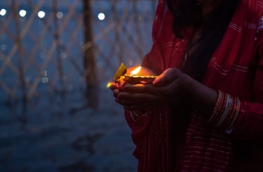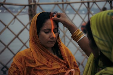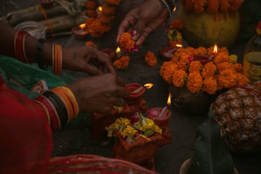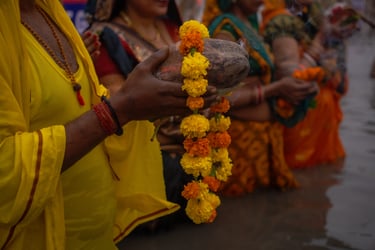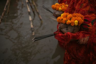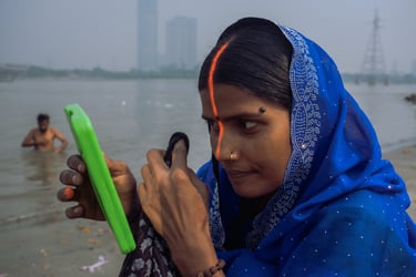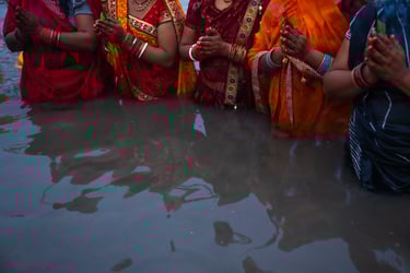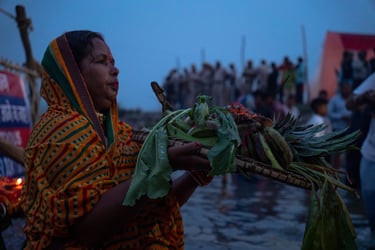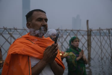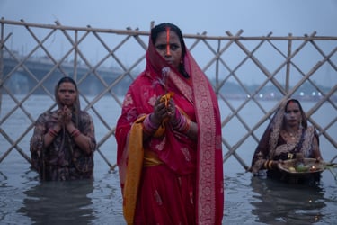DELHI, INDIA – People perform Chhath Puja rituals along the banks of the Yamuna River at Kalindi Kunj in New Delhi, offering fruits, light and prayers while standing in the water during sunrise and sunset ceremonies, in October 2025. A festival that honours all of nature's elements, a celebration rooted in tradition, a time to express gratitude. The only festival that reminds us of our humble beginnings.